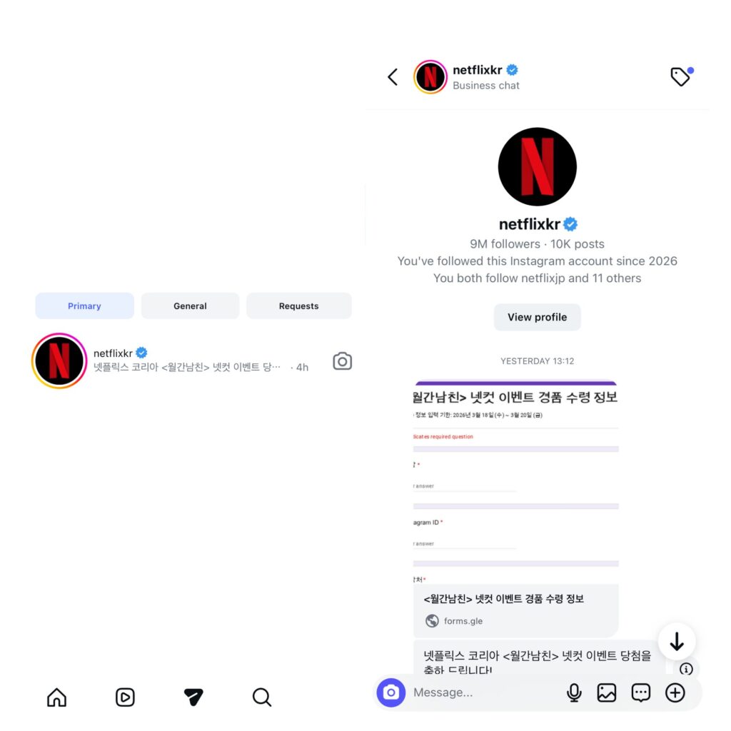 何気なくInstagramを開いたとき、見慣れたNetflixのロゴがメッセージ欄に表示されていました。